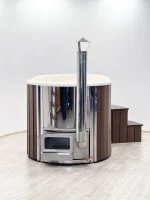 Integrierter Holzofen im Umfang des Fasses oder ein externer Holzofen, inklusive zwei Meter langem Schornstein und Kamindach
